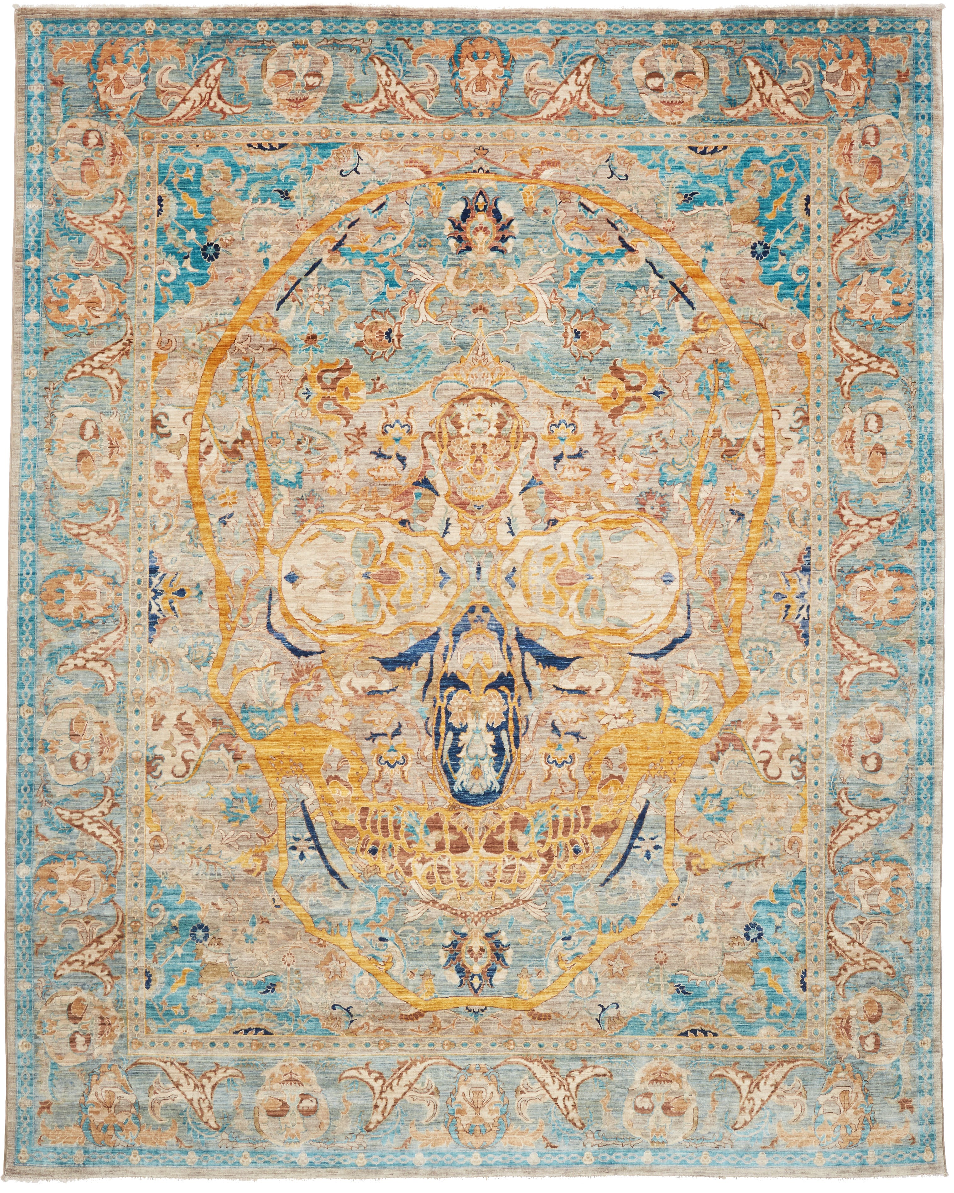 The design combines a richly layered, classical ornament with a carefully integrated skull motif that reveals itself gradually within the pattern. Soft shades of blue, aged gold, ivory and nuanced earth tones create a refined patina reminiscent of antique masterworks.