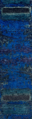 The result is a harmonious evolution of the original artwork, retaining its deep emotional resonance while adapting to new proportions. In this mirrored edition, the rich interplay of wool and silk captures light in shifting ways, highlighting the deep azure blues, coral greens, and aubergine purples that rest on a serene sea of indigo. The mirrored balance adds a quiet rhythm, making it equally compelling in standard rug sizes.