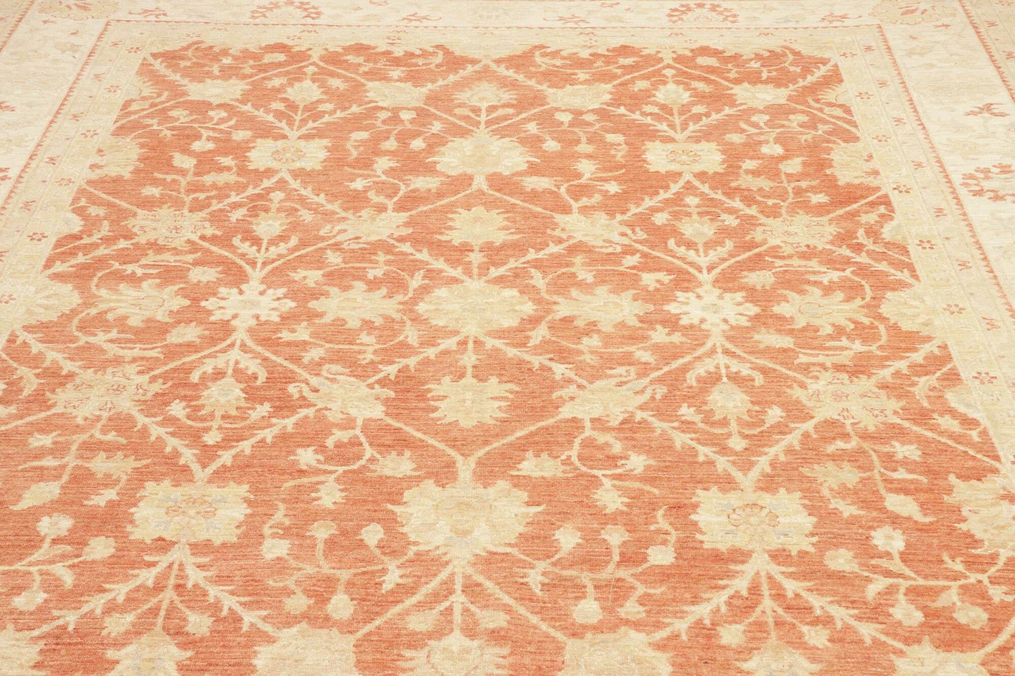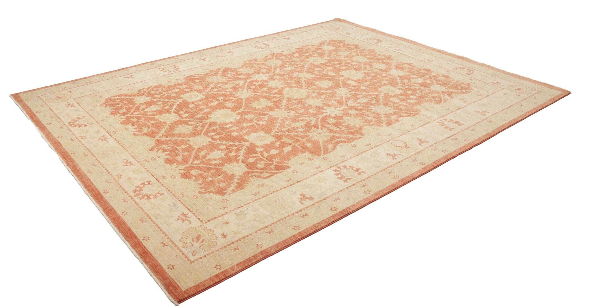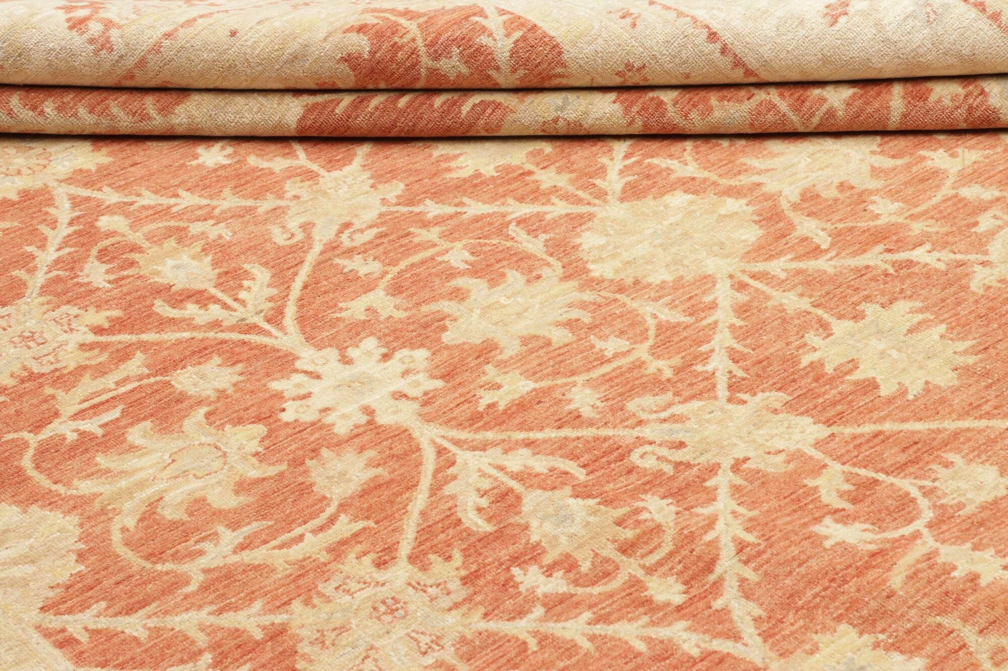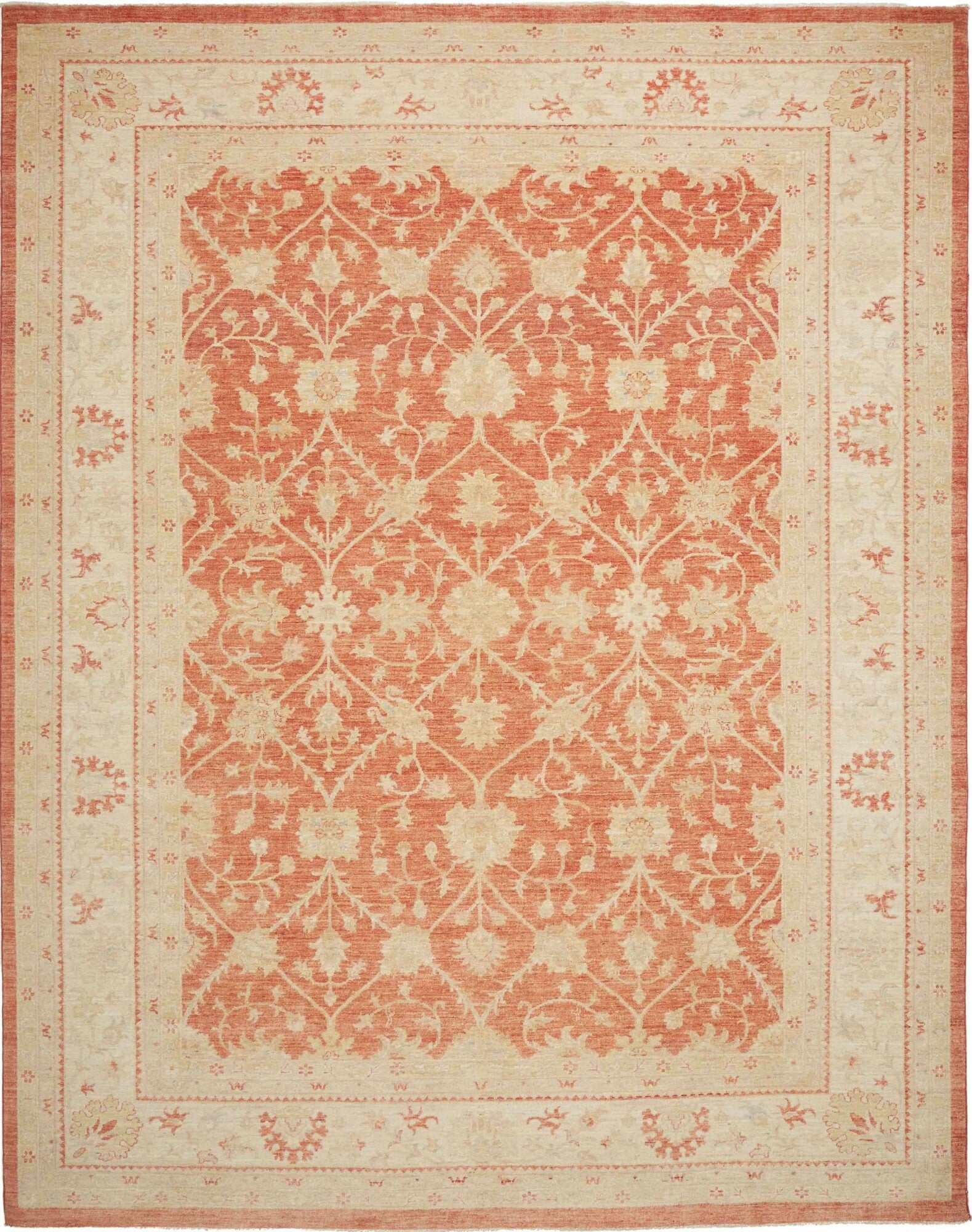 Pastelrode tapijten: De warme rode tinten worden verzacht met lichte bloemenpatronen in crèmekleurige tinten, wat een evenwichtig contrast creëert dat de delicate details van de motieven naar voren brengt. De randen in beige en okergeel creëren een omlijstingseffect, wat de diepte van het centrale veld versterkt. De scrollende wijnrankpatronen en symmetrische opstelling stralen elegantie en een gevoel van orde uit.