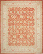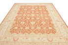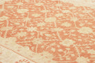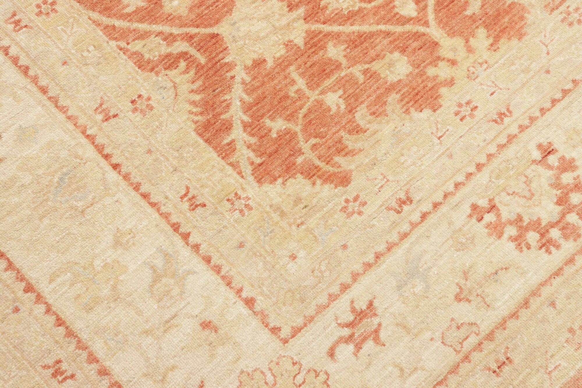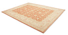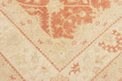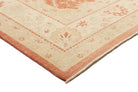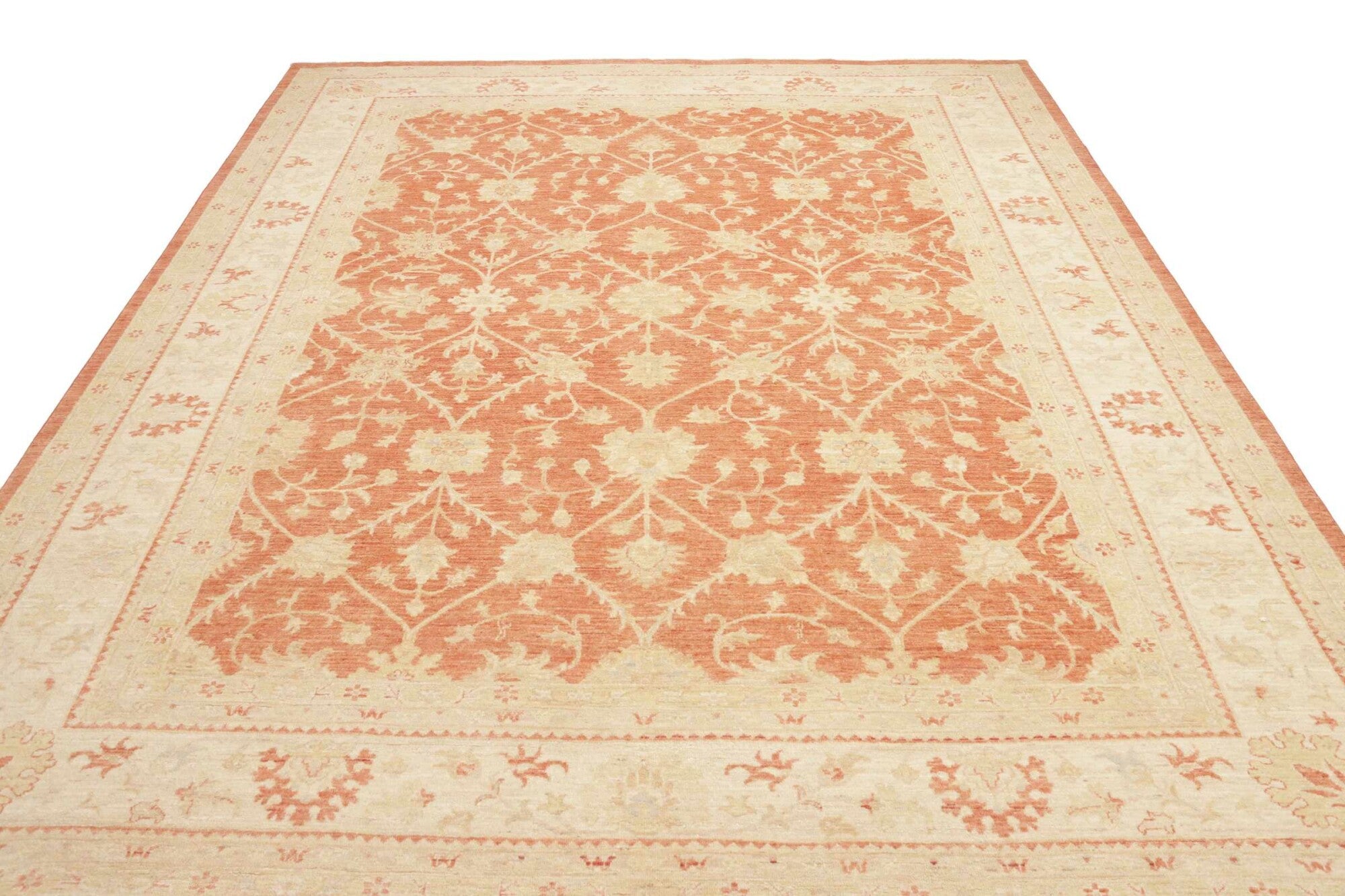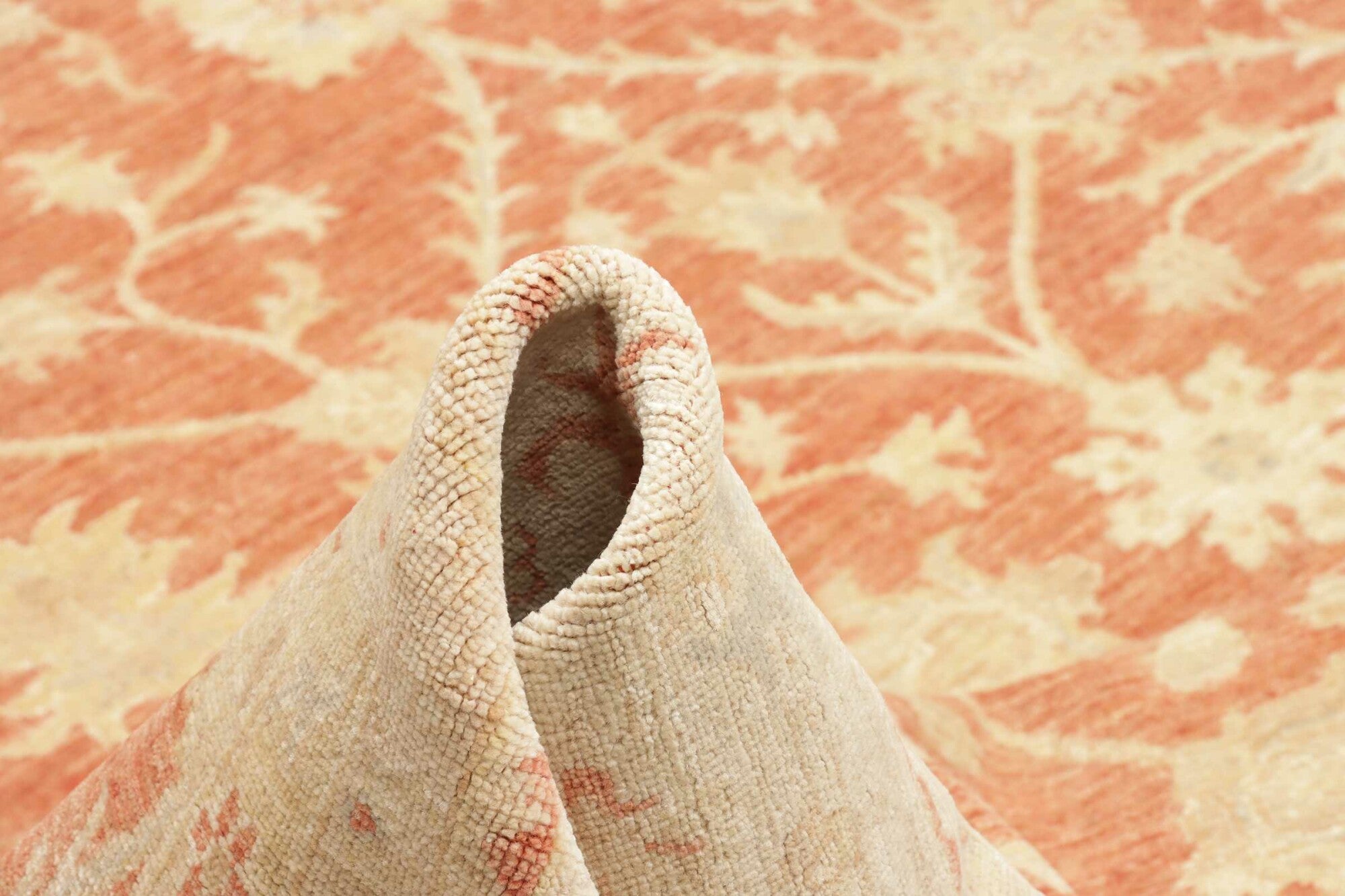 Pastelrode tapijten: De warme rode tinten worden verzacht met lichte bloemenpatronen in crèmekleurige tinten, wat een evenwichtig contrast creëert dat de delicate details van de motieven naar voren brengt. De randen in beige en okergeel creëren een omlijstingseffect, wat de diepte van het centrale veld versterkt. De scrollende wijnrankpatronen en symmetrische opstelling stralen elegantie en een gevoel van orde uit.